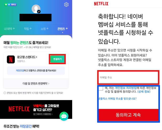 동일하게 멤버십의 '콘텐츠+' → '연결하기' → 이메일 주소란에 사용중인 넷플릭스 이메일 계정 입력 후 개인정보 처리방침 침 동의 선택, 동의하고 계속을 눌러주면, 네이버 멤버십과 넷플릭스의 연동을 완료할 수 있습니다.