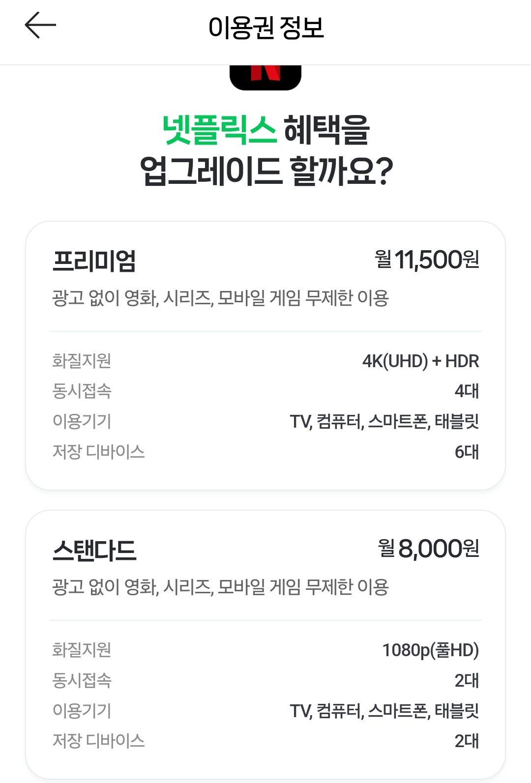 처음 넷플릭스 혜택의 업그레이드는 그 달의 멤버십 시작일을 기준으로 추가요금이 일할계산됩니다. 이후의 달 부터 정상적으로 스탠다드 업그레이드는 8,000원, 프리미엄으로의 업그레이드는 11,500원이 결제됩니다.