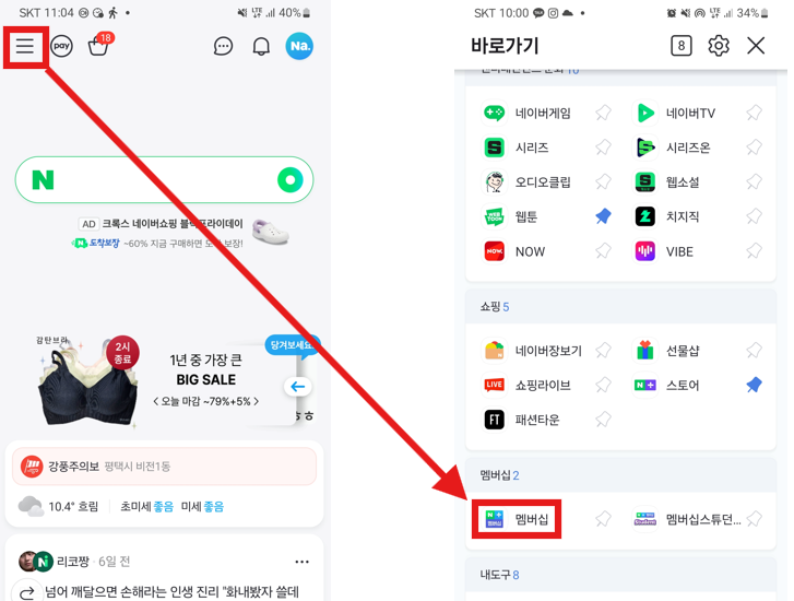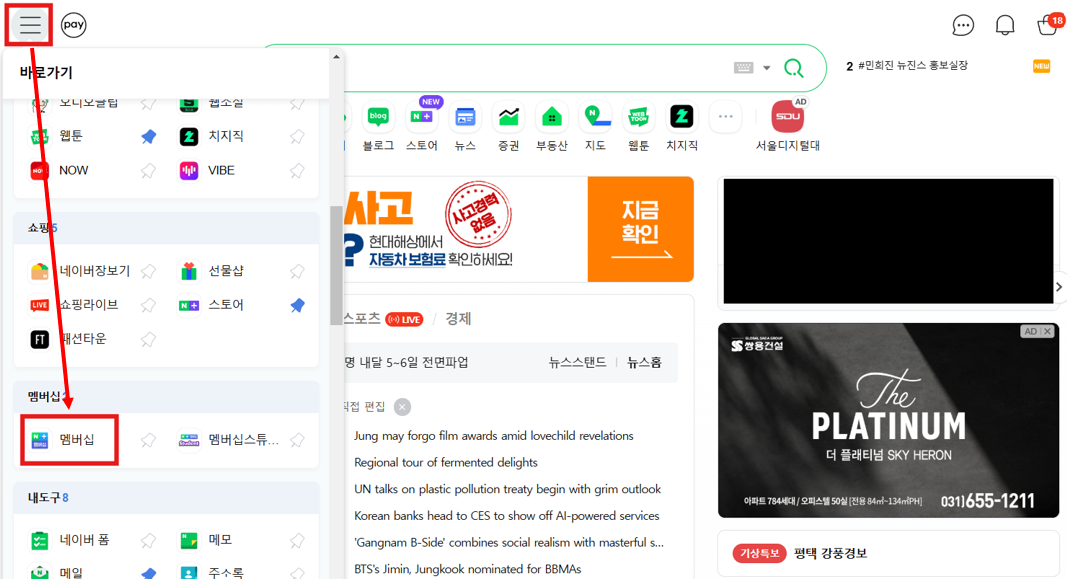 PC버전과 모바일 버전 모두 네이버 로그인 후, 좌측 상단의 세줄로 된 아이콘을 눌러 준 후 화면을 조금 내리면 바로가기 메뉴 중 '멤버십'을 선택해주세요.