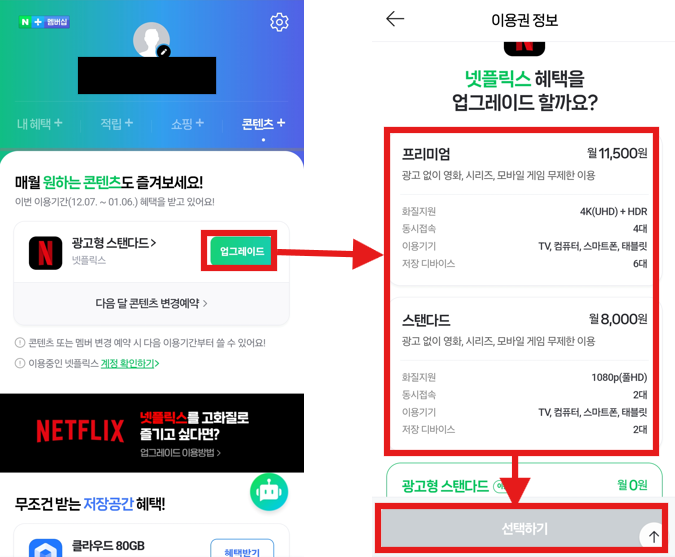 광고형 스탠다드의 광고가 싫으신 분들은 추가 요금을 지불하고 네이버 멤버십에 연결된 넷플릭스 혜택을 업그레이드 할 수 있습니다.