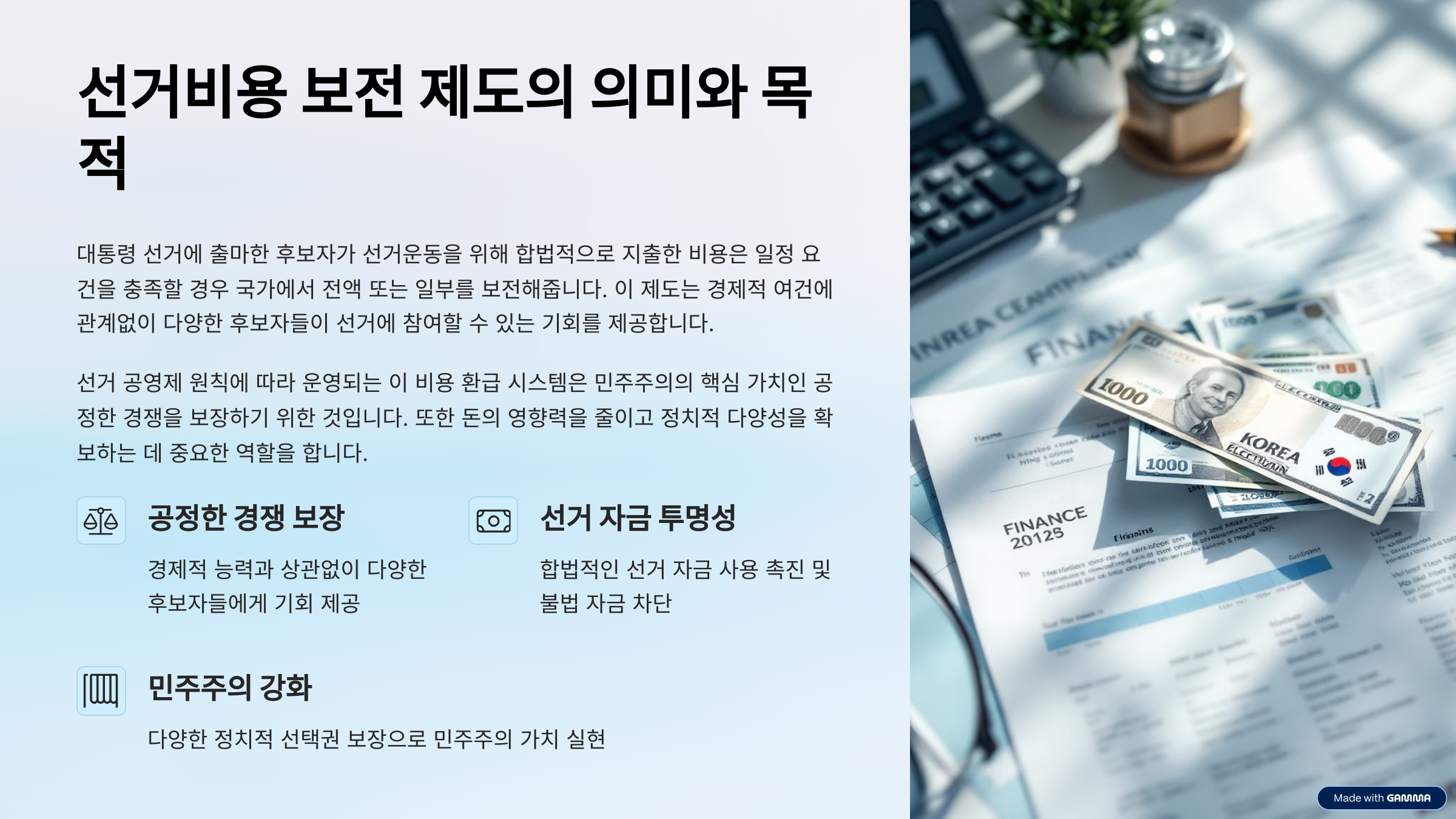 오늘은 대통령 선거비용 보전 제도, 득표율 조건, 비용의 사용처, 그리고 관련된 주요 쟁점까지 한눈에 정리해드립니다.