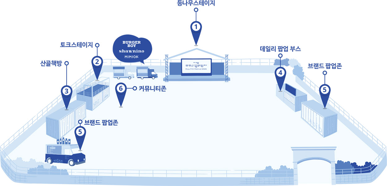 영화제의 핵심 무대인 등나무운동장은 하루 종일 다양한 프로그램이 이어지며 관객 참여 이벤트도 다채롭게 준비되어 있습니다.