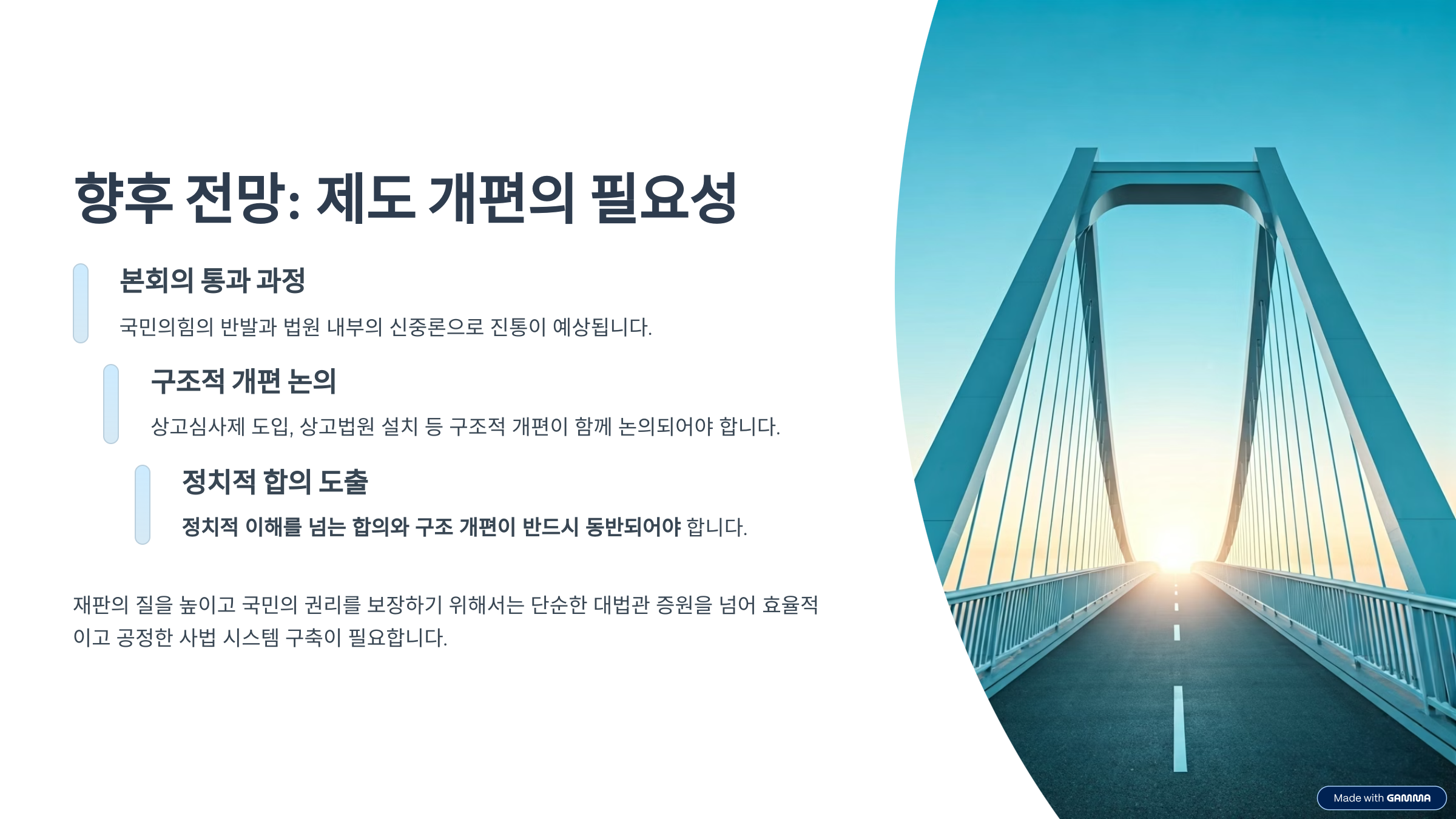 한편, 대법관 증원에 따른 우려의 목소리도 적지 않습니다. 전원합의체 판결이 어려워지고, 사법부의 독립성이 침해될 가능성도 제기되고 있습니다. 또한 예산 부담과 ‘코드 인사’ 논란 역시 이번 법안의 주요 쟁점입니다.