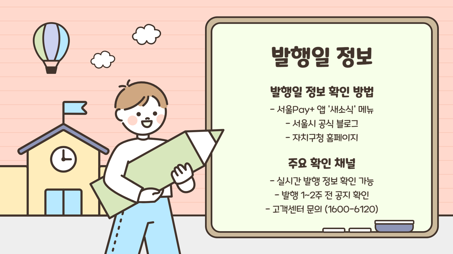 발행일 당일에는 서울Pay+ 앱 일부 기능(가맹점 찾기, 선물하기 등)이 중단되며, 접속 지연도 발생할 수 있습니다.