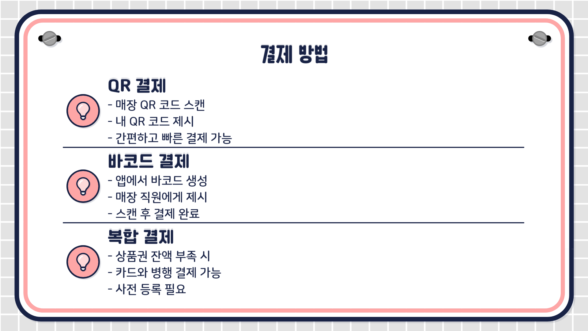 결제는 전용 앱에서 QR 또는 바코드를 생성하거나, 매장 QR을 스캔하는 방식입니다.