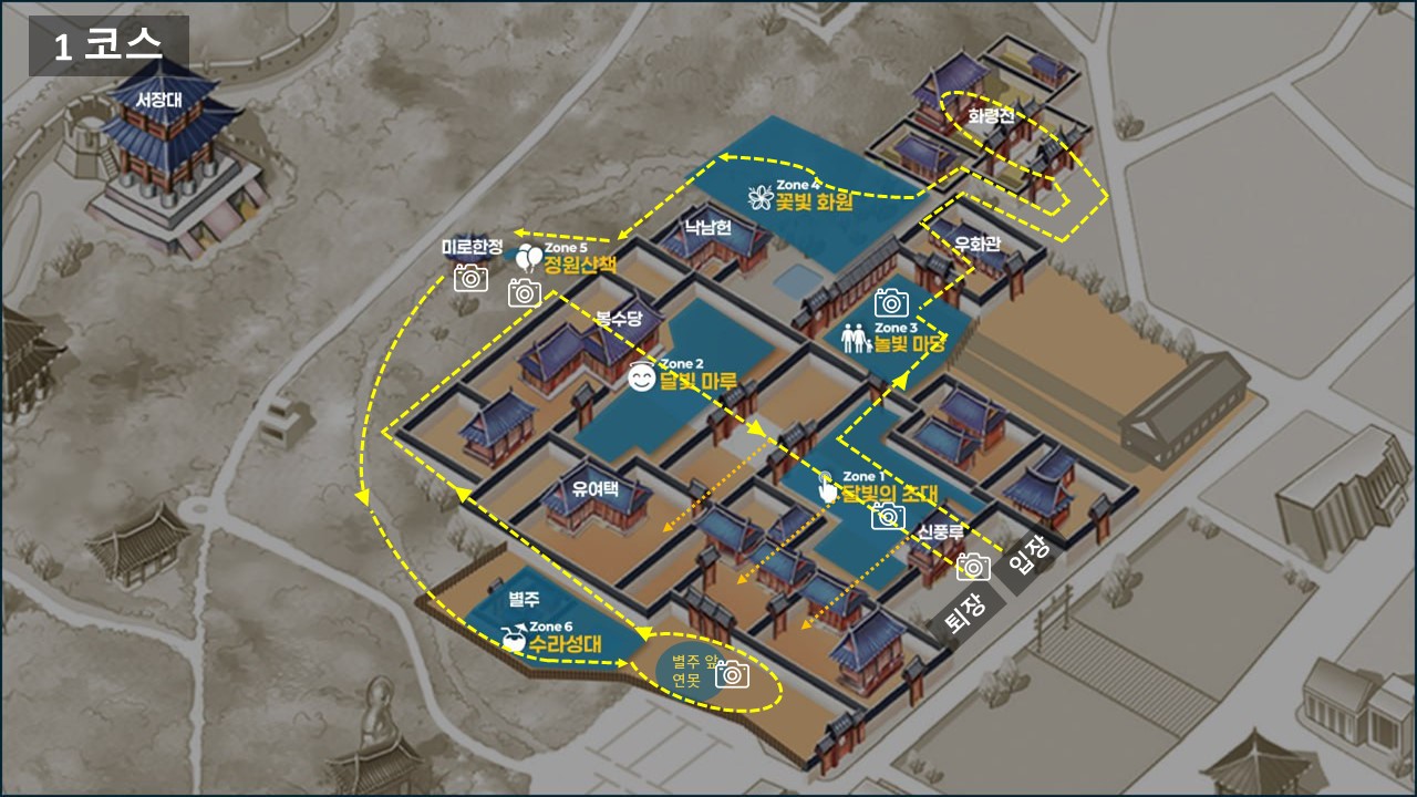 신풍루 → 우화관 → 화령전 → 낙남헌 → 미로한정 → 별주 → 봉수당 → 중양문 → 좌익문