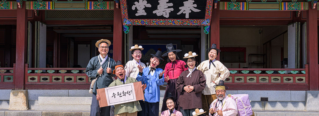 화성행궁의 건물 곳곳을 걸으며 1795년 정조의 수원행차를 테마로 한 이야기를 주민 배우들이 들려줍니다.