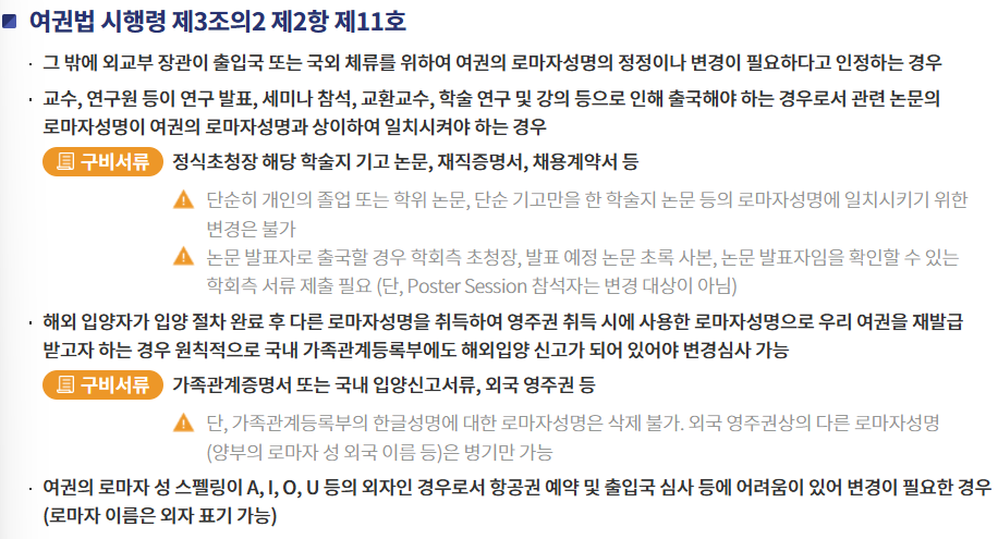 - 그 밖에 외교부 장관이 출입국 또는 국외 체류를 위해 여권의 영문성명의 정정이나 변경이 필요하다고 인정하는 사유(여권법 시행령 제3조의2 제2항 제11호)