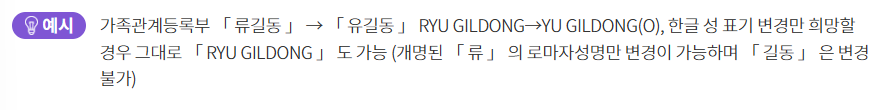 이 경우에는 가족 구성원이 함께 외국의 입출국 심사시 가족임을 증명하기 위해 성을 일치시키는 경우인데요. 이 케이스는 영문이름 중 '성'에 해당하는 부분만 변경이 가능하고 '이름'에 대당하는 부분은 변경할 수 없습니다.