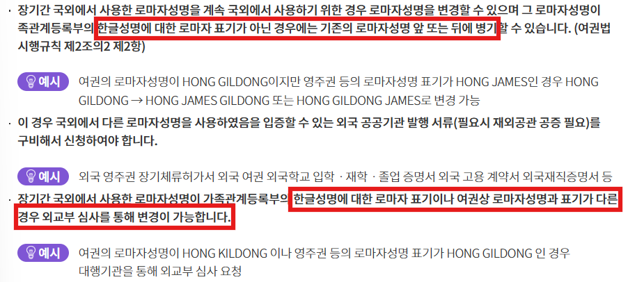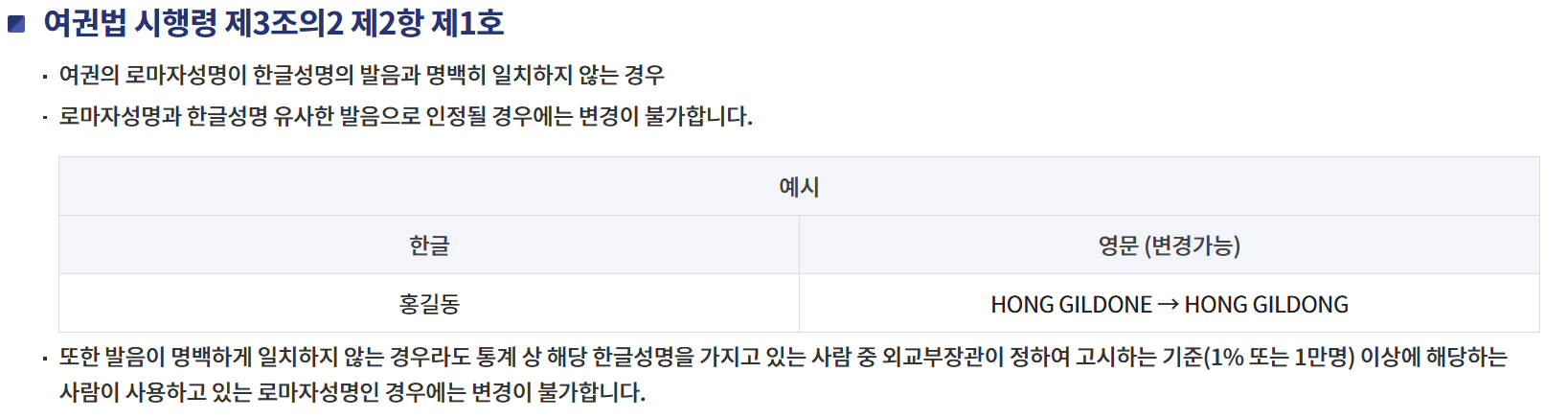더 자세한 사항은 아래 외교부 여권안내에서 고시하고 있는 '로마자성명의 정정 또는 변경이 되지 않는 기준에 관한 고시', '로마자표기 성명의 정정 등이 제한되는 예시 목록'을 참고해 주시기 바랍니다.