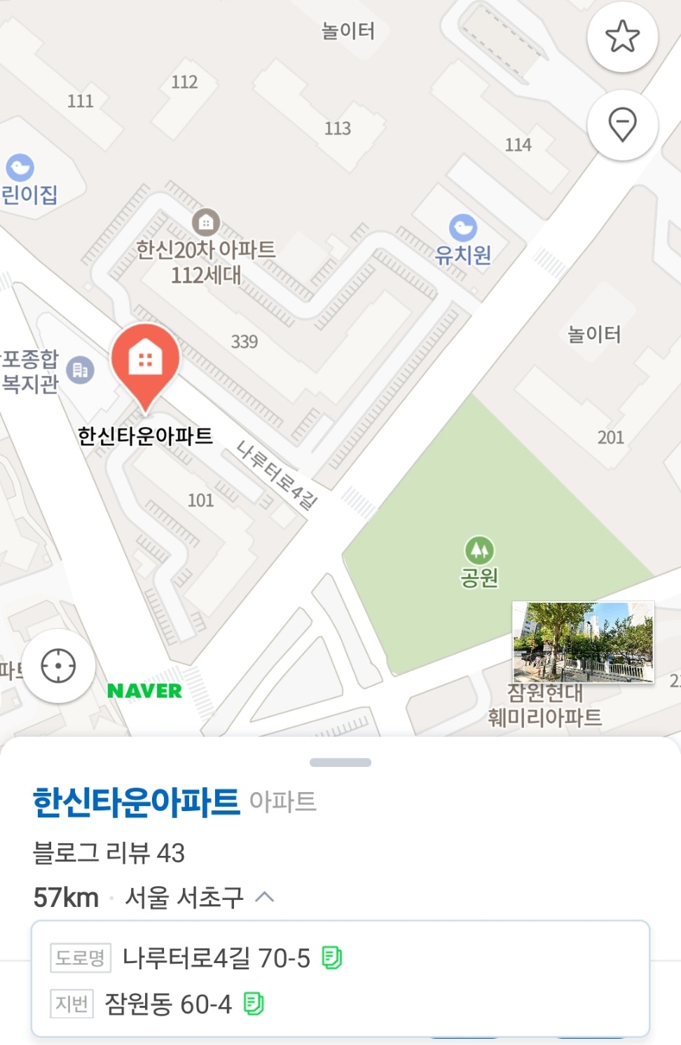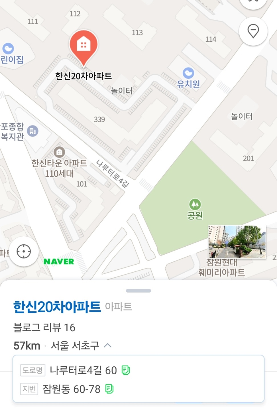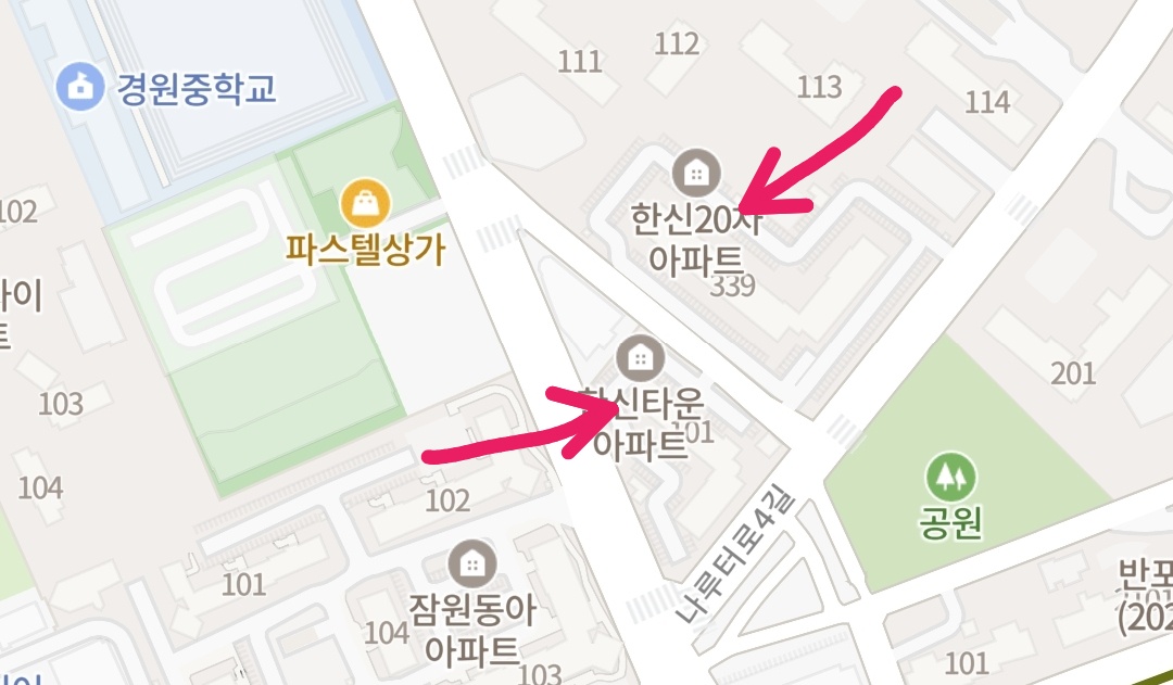 잠원동의 한신20차 아파트와 한신타운 아파트를 살펴볼텐데요. 두 곳 모두 도로명으로는 나루터로4길, 지번으로는 잠원동으로 동일합니다.