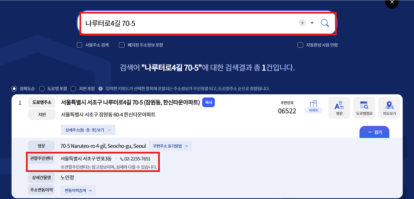 예를들어 '잠원동'이라고만 뜨면, 잠원동 주민센터, 반포3동이라고 뜨면 반포3동 주민센터가 관할 주민센터인 것입니다. 검색 한번으로 관할 주민센터를 찾을 수 있는 편리한 방법입니다. 가장 정확한 방법이라고 볼 수 있어요.