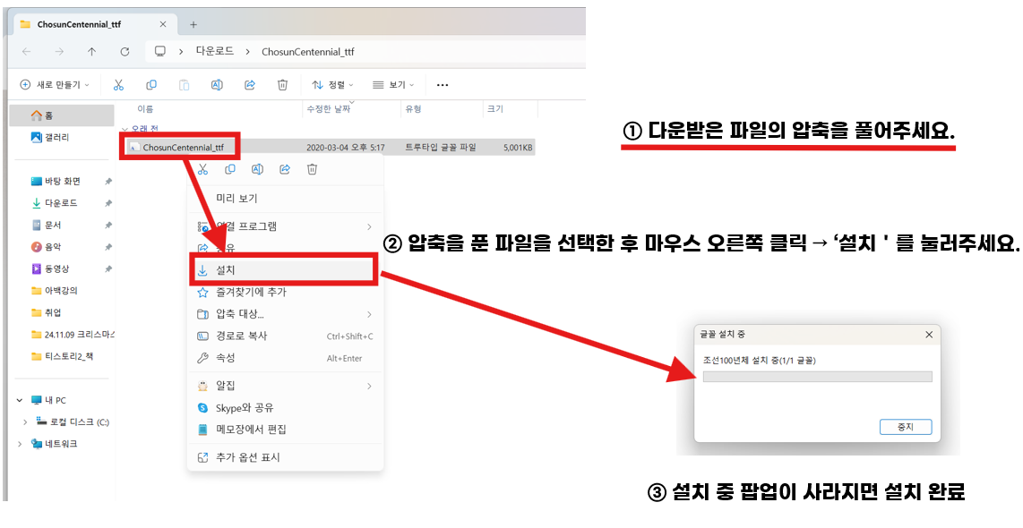 압축을 푼 글꼴파일을 선택 후, 마우스 오른쪽을 클릭해 '설치'를 눌러주세요.