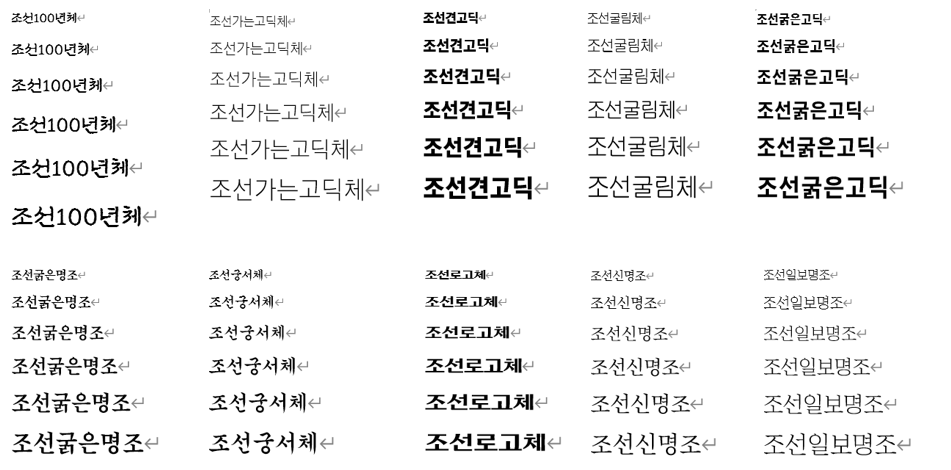 제공하는 서체 9종의 종류로는 조선신명조, 조선굵은명조, 조선가는고딕, 조선굵은고딕, 조선견고딕, 조선굴림체, 조선궁서체, 조선로고체, 조선일보명조이며 각각 다운받아 설치 가능합니다.