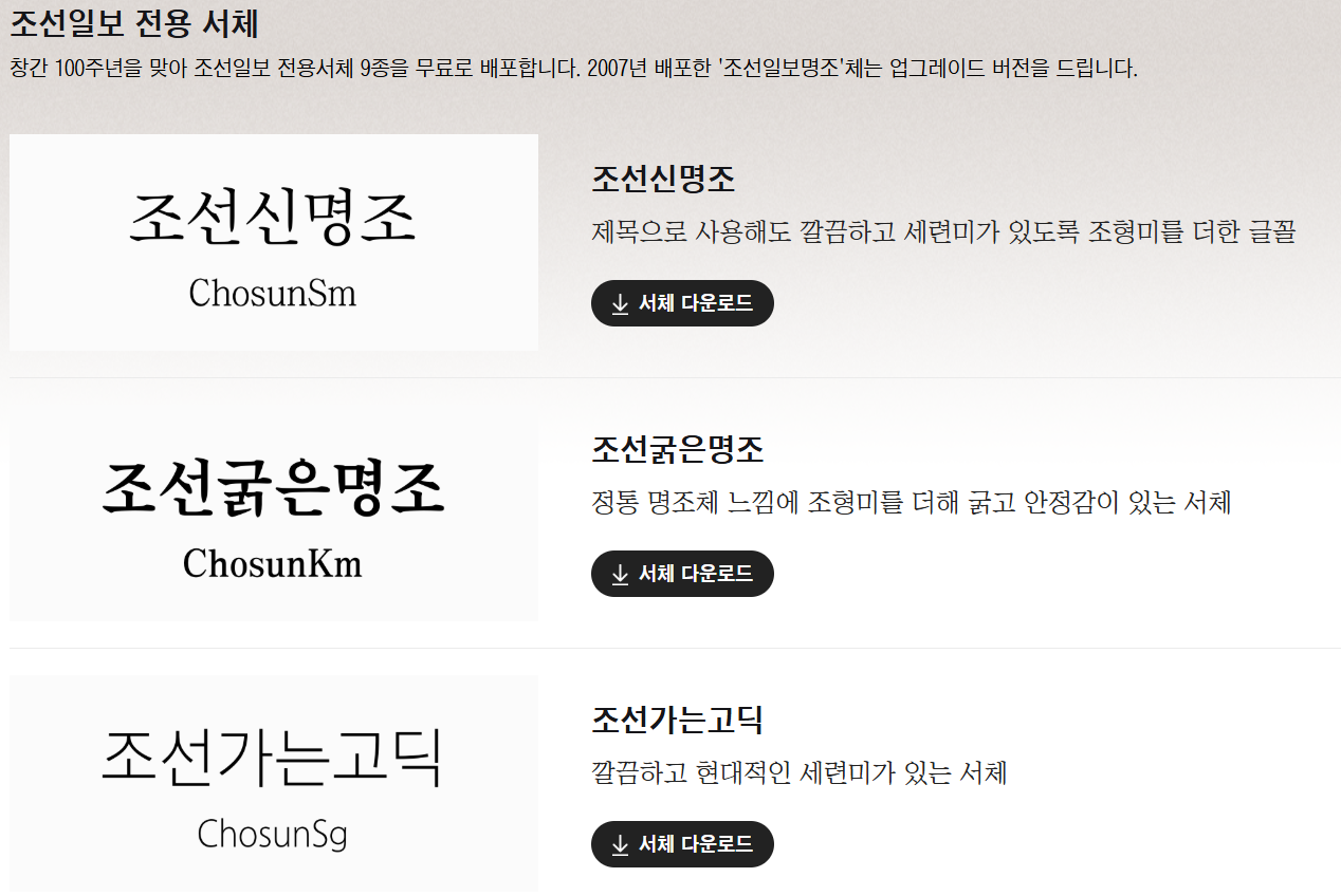 조선100년체와 조선일보 전용 서체 9종은 모두 아래 링크의 홈페이지를 통해 받으실 수 있습니다. 단, 100년체와 전용 서체 모두 PC에서 다운이 가능하다는 점 참고 부탁드려요.