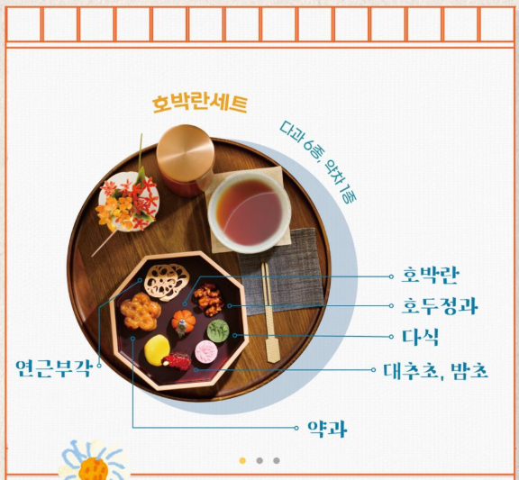 - 호박란 세트: 호박란, 연근부각, 다식, 약과, 대추초·밤초, 호두정과