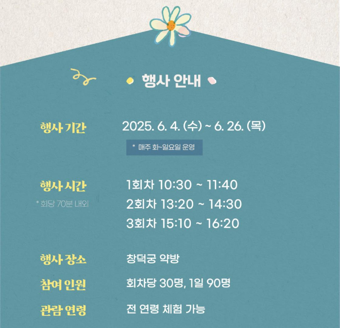 2025년 6월, 창덕궁에서 열리는 특별한 체험 프로그램 ‘약다방’이 일반 관람객을 대상으로 다시 찾아옵니다. 왕실의 전통과 치유의 지혜가 담긴 약방에서의 다과 체험은 단순한 관광을 넘어 특별한 감성 경험을 제공합니다. 5월 12일부터 참가신청이 시작되니, 기간 간을 놓치지 마세요.
