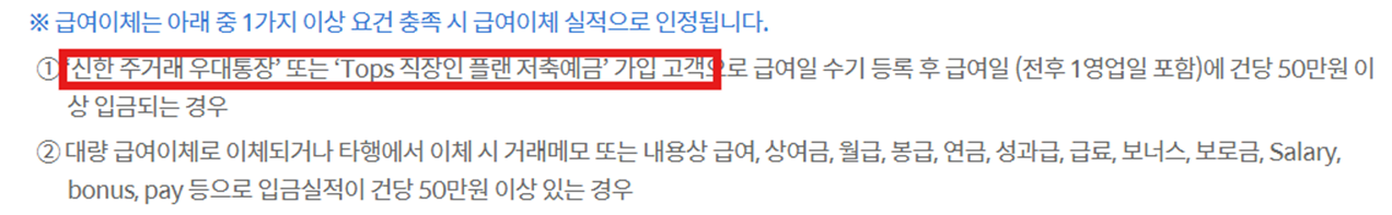 - 지정일자 전 5영업일 또는 후 10영업일 이내, 건별 50만원 이상 입금거래 있는 경우(급여일자 등록 필수)