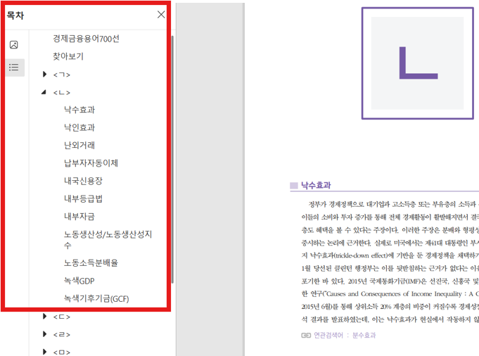 경제금융용어 700선을 활용하는 방법은 다양한데요. 가장 첫번째로 경제 뉴스에서 모르는 용어가 등장할 때 용어집을 참고하는 방법입니다. PDF 파일로 제공되기 때문에 책갈피 기능을 통해 더욱 빠르게 원하는 용어를 찾아볼 수 있는 편의성을 갖추고 있어 실생활에서 모르는 용어들을 빠르게 찾아볼 때 유용하게 사용할 수 있습니다.