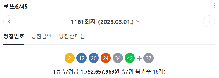 - 1161회 당첨번호: 2, 12, 20, 24, 34, 42 입니다.