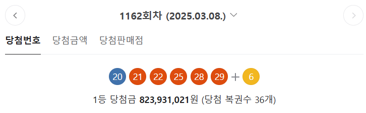 ✅ 당첨번호: 20, 21, 22, 25, 28, 29 (보너스 번호 6)