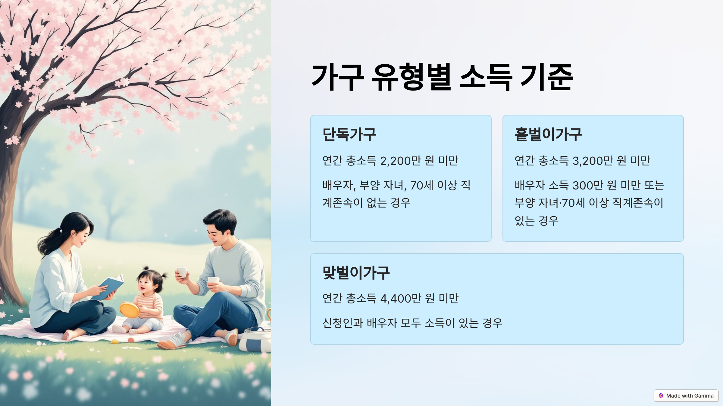 - 단독가구: 연간 총소득 2,200만 원 미만