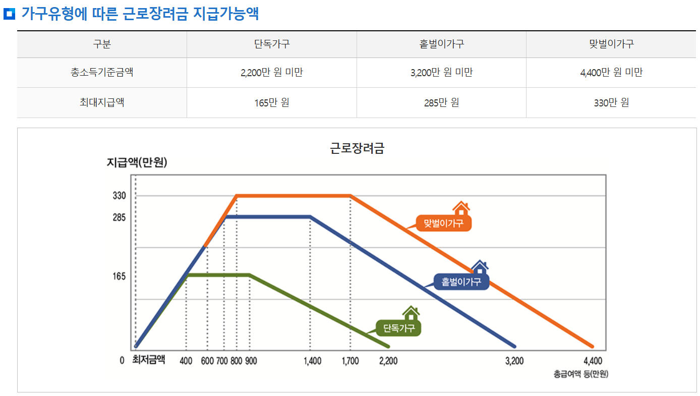 근로장려금을 신청하려면 아래의 가구 유형 및 소득 기준, 재산 기준을 충족해야 합니다.