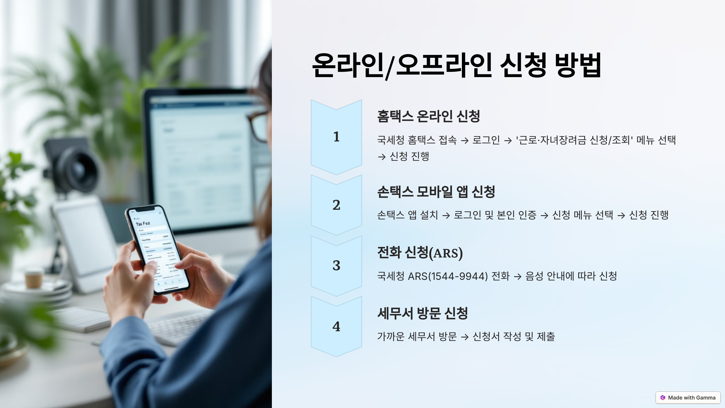 근로장려금은 다음 4가지 방법으로 신청할 수 있습니다.