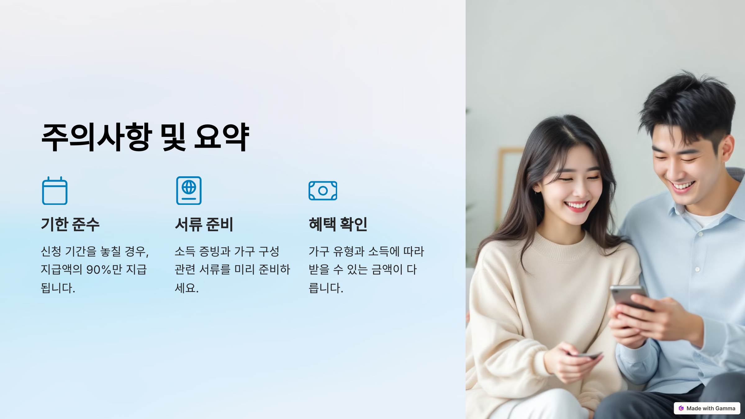 - 신청 시 소득 및 재산 정보를 정확하게 입력해야 하며, 오류가 발생할 경우 지급이 지연되거나 불이익이 있을 수 있습니다.