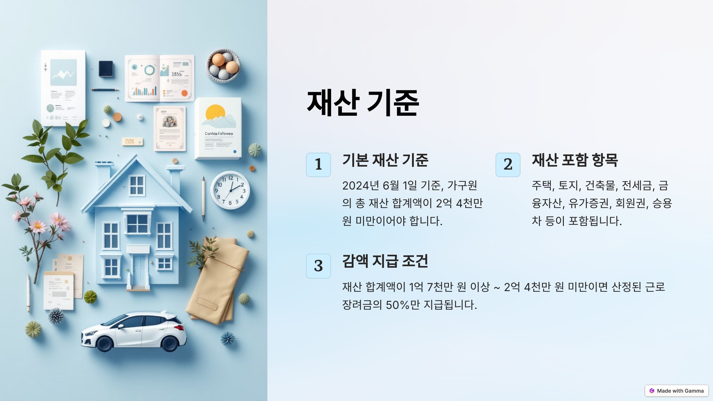 - 2024년 6월 1일 기준, 가구원의 총 재산 합계액이 2억 4천만 원 미만이어야 합니다.