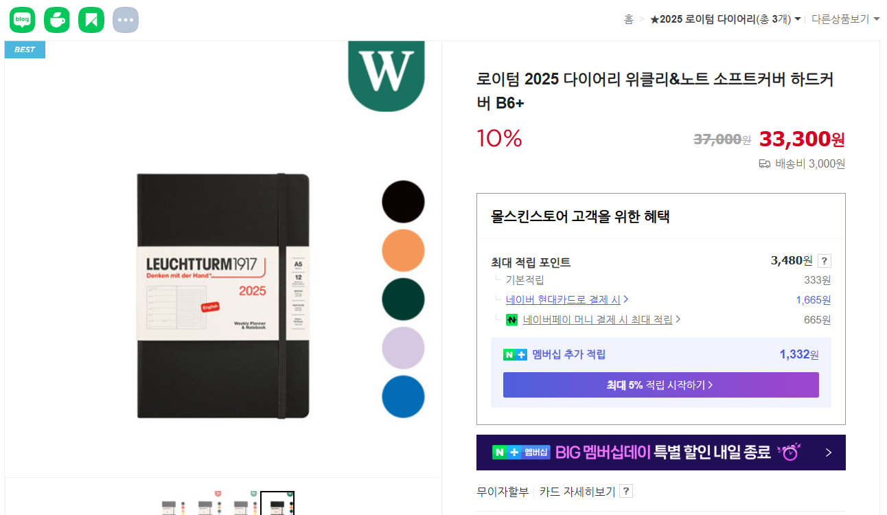 몰스킨과 비슷한 느낌을 풍기는 다이어리입니다. 다만 몰스킨이 조금은 무게있고 기본적인 색감이라면 로이텀은 더 다채로운 색깔의 상품을 판매한다는 것인데요. 특히 만년필을 쓰시는 분들께 추천드리는 상품입니다. 다이어리를 소개해드리고 있지만 노트도 좋으니 불렛저널을 쓰시는 분들이라면 로이텀의 노트도 한 번 써보시는 것을 추천드립니다.