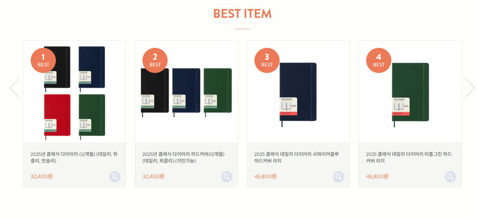 스타벅스 다이어리로 유명한 몰스킨입니다. '다이어리'라고 하면 생각나는 클래식한 느낌의 다이어리입니다. 저도 3년정도 몰스킨에서 나온 다이어리를 사용중이데요. 보통은 매년 기본색 이외의 색으로 된 상품이나 콜라보 제품을 내놓는데 올해는 눈에 띄는 콜라보제품은 없는 것같아 보입니다. 그래도 몰스킨이 제공하는 깔끔하고 정돈된 다이어리 양식의 매력은 무시할 수 없습니다.