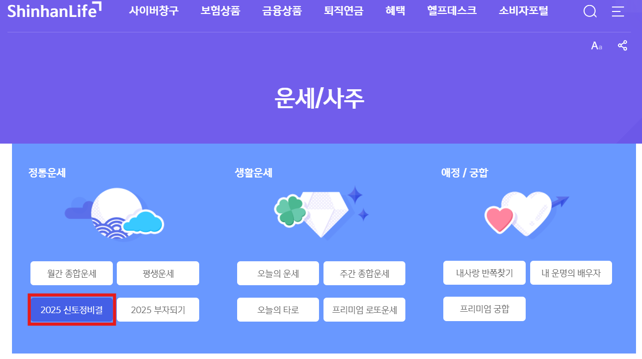 오래전 부터 무료 운세로 유명했던 전통의 신한생명 운세입니다. 신한생명도 11월 기준으로 2025년 신년운세를 제공하고 있어요. 운세의 구성은 NH 농협은행의 2025 신토정비결과 같이 총론, 재물운, 직장/사업운, 가정/건강운, 이성/대인관계, 월별운세로 구성되어 있습니다.