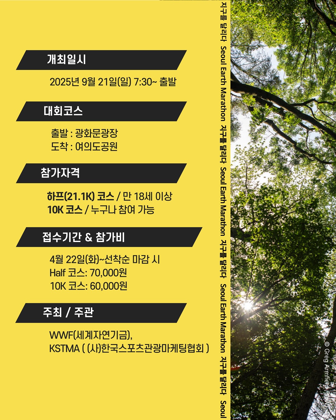 2025 서울어스마라톤은 WWF(세계자연기금)와 (사)한국스포츠관광마케팅협회가 공동 주최하고, 서울시와 대한육상연맹 등의 후원으로 진행됩니다. '지구를 달리다'를 주제로 하며, 지속가능 친환경 스포츠 ECOS 인증을 받은 의미 있는 행사입니다. 시민들의 적극적인 참여를 통해 지구를 지키는 움직임을 확산하고자하는 목표를 가지고 있습니다.