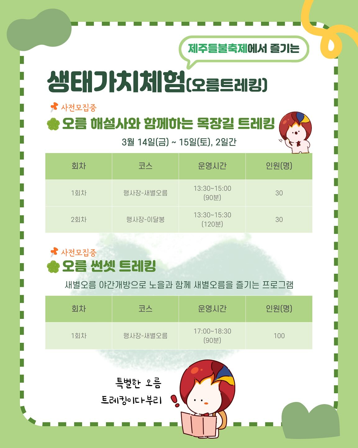 이중 오름도슨트와 함께하는 오름 투어, 썬쎗 트래킹, 디지털 횃불 트레킹, 사운드스케이프 체험은 3월 14일까지 사전 접수 및 현장 접수신청을 받고 있어요. 단, 선착순 신청이기 때문에 서두룰 수록 좋다는거! 참가비도 무료! ✨ 오름체험 프로그램 예약 바로가기 ✨