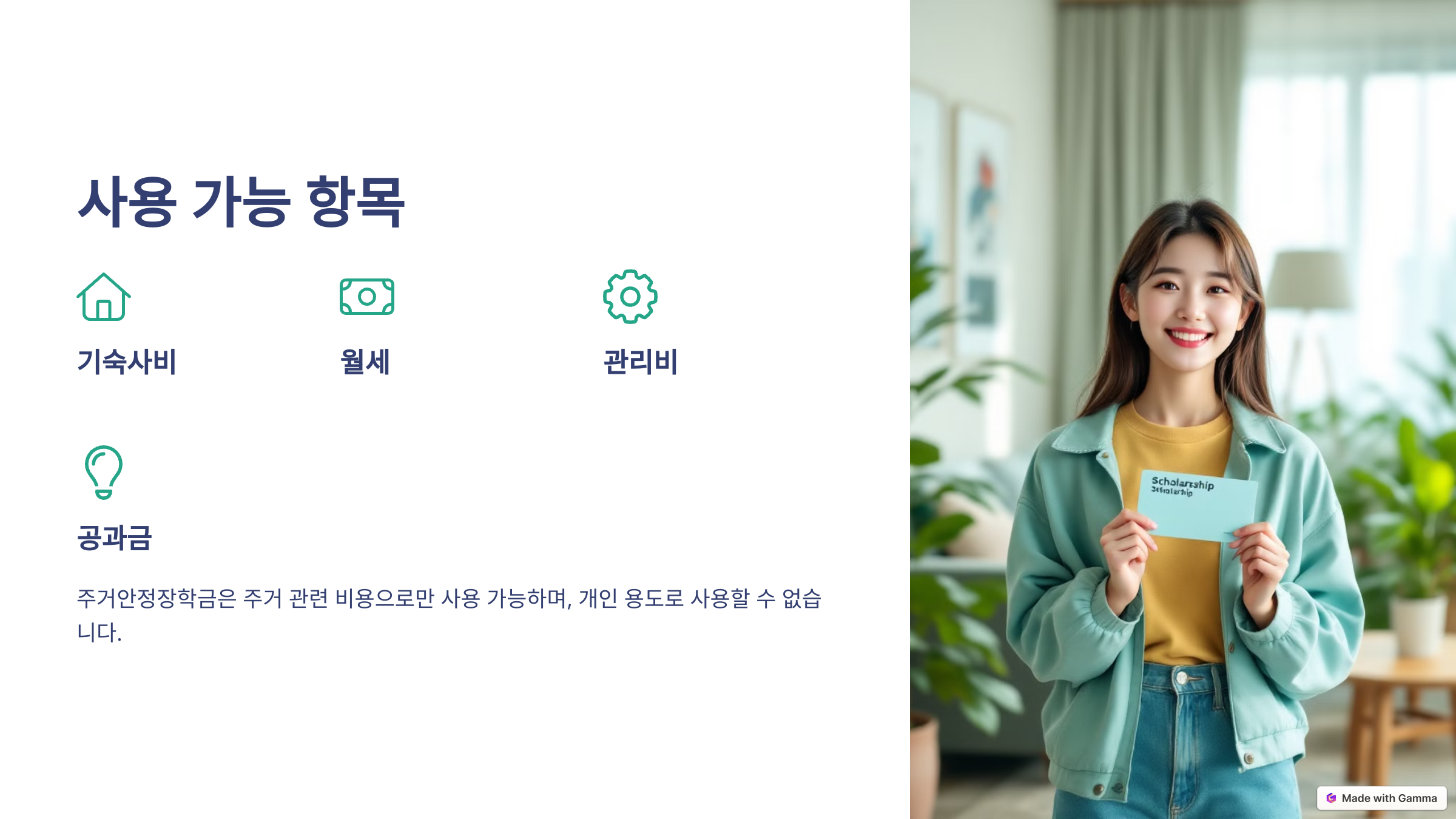 지원금은 주거 비용 전용으로만 사용 가능하며, 현금 인출은 불가합니다.