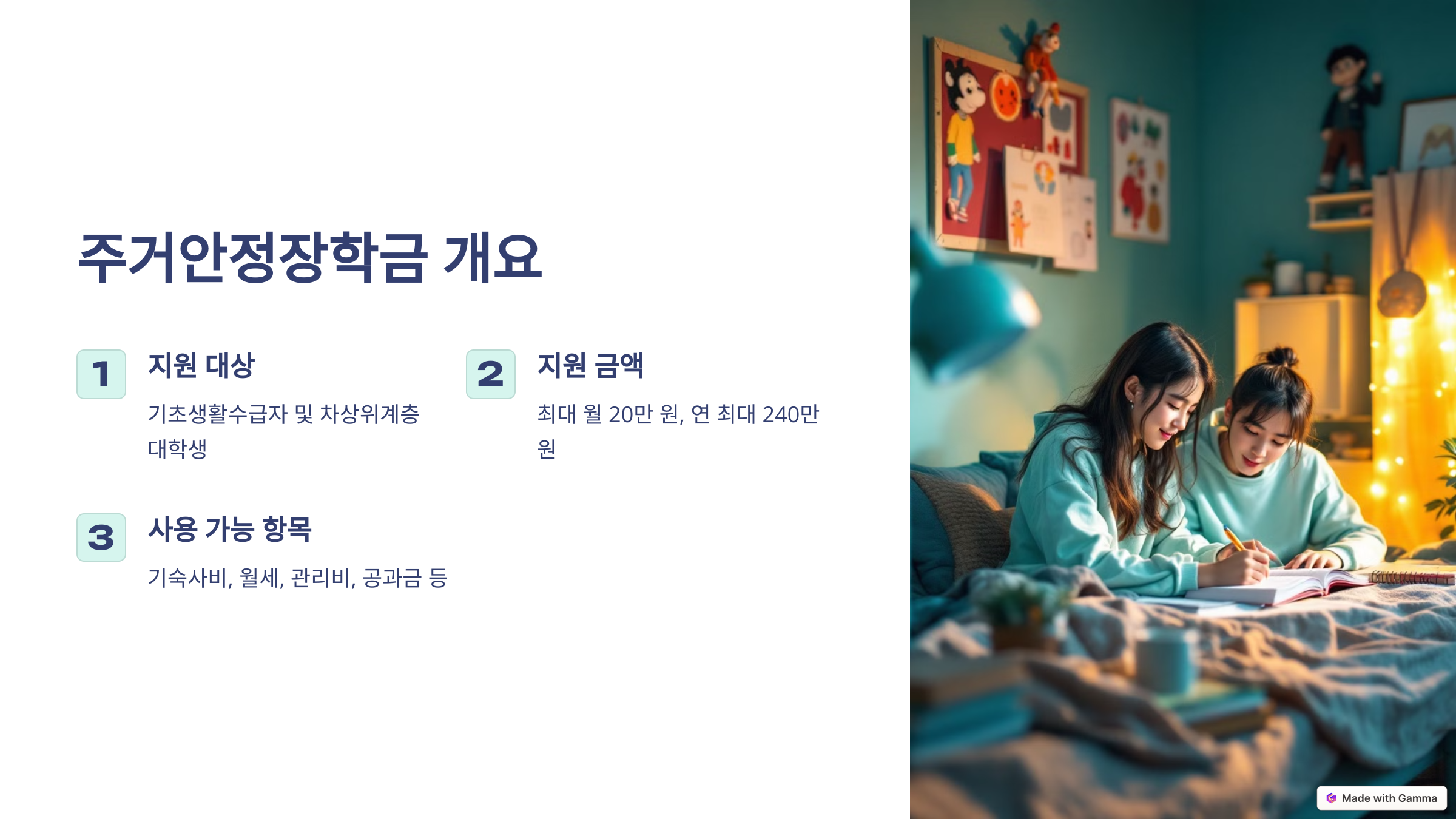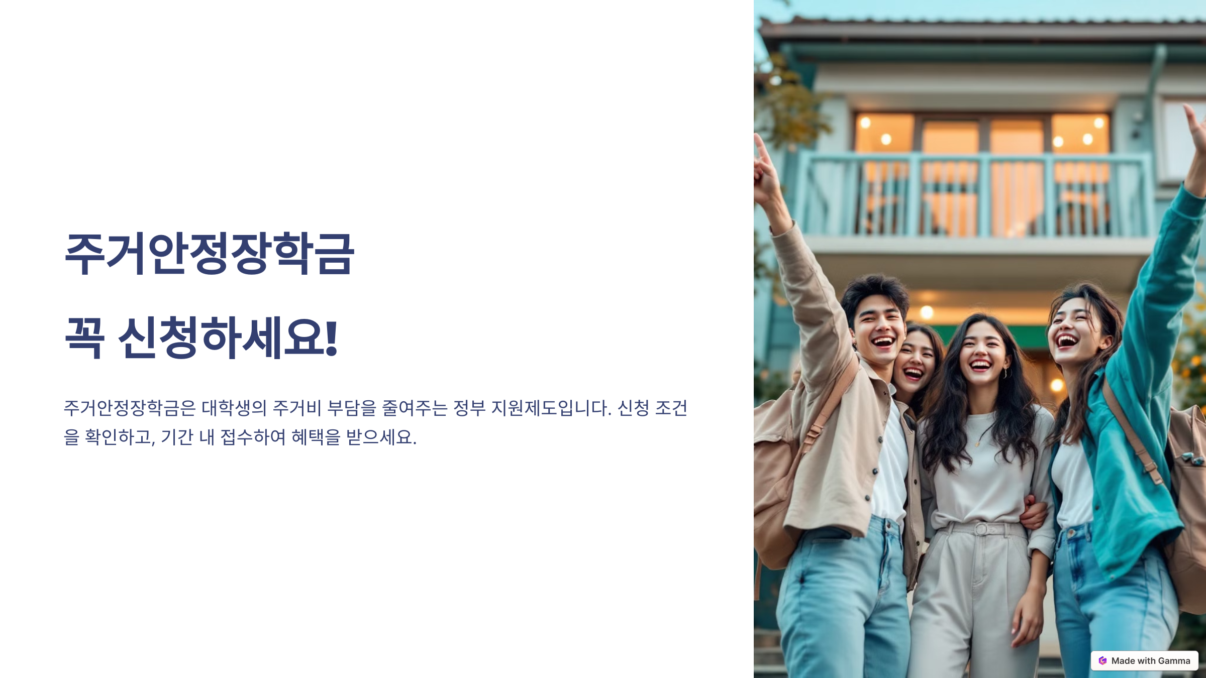 주거안정장학금은 학업에 집중할 수 있도록 대학생의 주거비 부담을 줄여주는 정부 지원제도입니다.